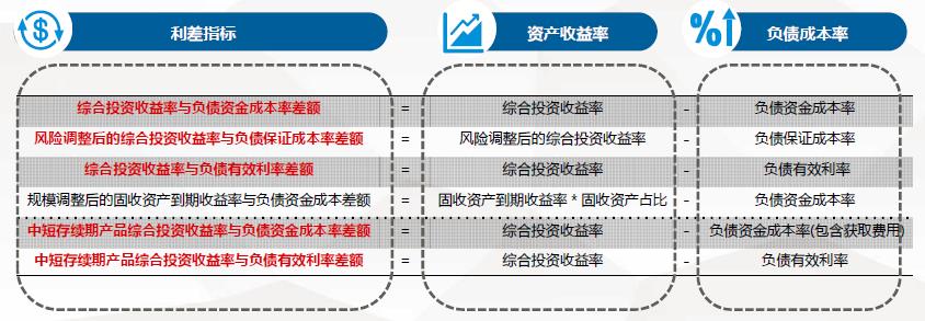 收益率指標(biāo)包括會(huì)計(jì)投資收益率和綜合投資收益率。未來季度穩(wěn)定的現(xiàn)金流入,如固收類資產(chǎn)的到期收入、權(quán)益類資產(chǎn)確定發(fā)放的分紅、房地產(chǎn)的房租收入等會(huì)納入在年化投資率的計(jì)算中。負(fù)債成本率包括負(fù)債資金成本率和負(fù)債保證成本率。通過賬戶資產(chǎn)規(guī)模和未來負(fù)債支出計(jì)算出的負(fù)債有效利率(IRR),可以一定程度反映出公司包括死差、利差、費(fèi)差在內(nèi)的整體情況。中短存續(xù)期產(chǎn)品在計(jì)算有效利率時(shí),如不能拆分對(duì)應(yīng)投資資產(chǎn),應(yīng)使用法定準(zhǔn)備金替換賬戶帳面價(jià)值進(jìn)行計(jì)算。