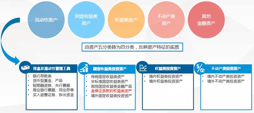 資產(chǎn)分類由原先五分類變?yōu)樗姆诸?,反映資產(chǎn)特征的實(shí)質(zhì)。其中固定收益類投資資產(chǎn)分為五類。傳統(tǒng)固定收益資產(chǎn)分為定期存款、協(xié)議存款、結(jié)構(gòu)性存款、(準(zhǔn))政府債券、金融債券、企業(yè)(公司)債、中期票據(jù)、債券基金;非標(biāo)準(zhǔn)固定收益類資產(chǎn)指基礎(chǔ)設(shè)施債權(quán)投資計(jì)劃、固定收益類保險(xiǎn)資管產(chǎn)品、不動(dòng)產(chǎn)債權(quán)投資計(jì)劃;含保證條款的權(quán)益類資產(chǎn)為優(yōu)先股債務(wù)工具、有保證條款的股權(quán)投資計(jì)劃、含保證條款的私募股權(quán)投資基金等;其他固定收益類金融產(chǎn)品包括商業(yè)銀行理財(cái)產(chǎn)品、信貸資產(chǎn)支持證券、融資類信托計(jì)劃、資產(chǎn)支持專項(xiàng)計(jì)劃、項(xiàng)目資產(chǎn)支持計(jì)劃等。
