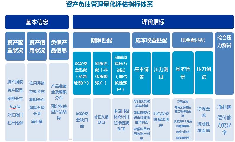 財產(chǎn)保險公司資產(chǎn)負債管理量化評估由包括基本信息(資產(chǎn)配置狀況、資產(chǎn)信用狀況、負債產(chǎn)品信息)和評價指標體系(匹配情況和綜合壓力測試)。