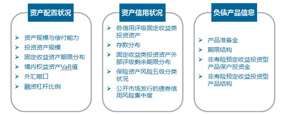 基本信息包含了公司的資產(chǎn)端的配置狀況、信用狀況還有負債端的產(chǎn)品結(jié)構(gòu)、業(yè)務規(guī)模等信息。通過這些信息可以描繪出保險人的輪廓包括資產(chǎn)和負債特征、財務狀況等。在資產(chǎn)配置狀況里面包括配置規(guī)模、配置比例、期限分布、Var值、外匯敞口、杠桿比例。負債產(chǎn)品信息包括產(chǎn)品準備金、期限分布、約定收益和結(jié)果的情況。