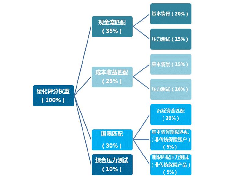 量化評估指標評分規(guī)則總分是100分,分為三個匹配和一個綜合測試,并賦予不同的權(quán)重,對于產(chǎn)險公司最重要的現(xiàn)金流匹配賦予最高權(quán)重35%,對于大多數(shù)保險公司來說沒有非傳統(tǒng)保險賬戶,。如果公司沒有非傳統(tǒng)保險賬戶,對應非傳統(tǒng)保險賬戶期限匹配評估項評估得分為0分,同時在總分中扣除此項評估內(nèi)容的分值,并將最終得分按比例調(diào)整為百分制得分。