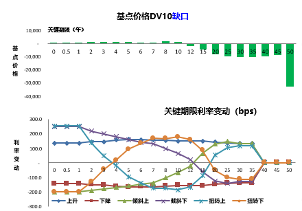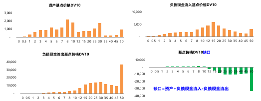 根據(jù)分布圖可以看出,關(guān)鍵利率久期對(duì)資產(chǎn)較敏感的時(shí)期是在前10年,而對(duì)負(fù)債現(xiàn)金流入的敏感期是10-15年之間,至于負(fù)債現(xiàn)金流出的部分,關(guān)鍵利率久期在前期的負(fù)債維度很小,但在中長期比較敏感。根據(jù)這些數(shù)據(jù),可以計(jì)算關(guān)鍵利率久期缺口=資產(chǎn)+負(fù)債現(xiàn)金流入-負(fù)債現(xiàn)金流出。結(jié)果表示,前10年的久期缺口均為正,在這段時(shí)間內(nèi),資產(chǎn)對(duì)利率變動(dòng)的敏感程度較負(fù)債流出更為明顯。10年之后到50年都是負(fù)缺口,這段期間負(fù)債對(duì)利率的變動(dòng)更為敏感。該缺口數(shù)據(jù)可以用來測算在不同的利率變動(dòng)情景下的資本要求。