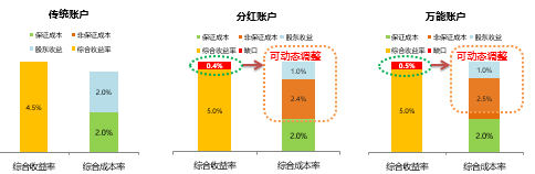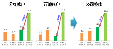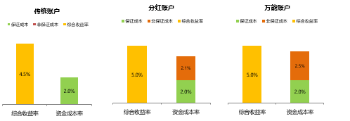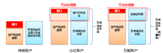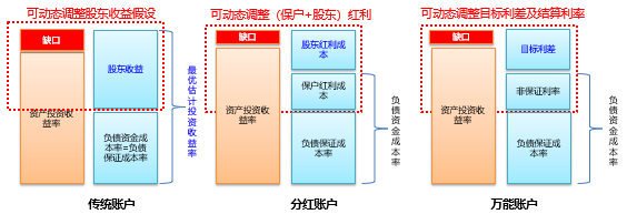 傳統(tǒng)賬戶的負(fù)債資金成本與保證成本一致,一般為2%或2.5%,費(fèi)改后不超過3.5%。右邊是負(fù)債保證成本率,左邊為資產(chǎn)收益率,此處會(huì)出現(xiàn)缺口。對(duì)于分紅賬戶來說,負(fù)債資金成本包含保證利率與非保證利率(保戶紅利),將其與資產(chǎn)投資收益率進(jìn)行比較,負(fù)債資金成本率中的保戶紅利成本由公司自行宣告決定,因此該部分留有一定空間,可以動(dòng)態(tài)調(diào)整、核心管控。對(duì)于萬能賬戶,其負(fù)債資金成本包括保證利率和非保證利率,這兩者也即萬能賬戶的結(jié)算利率。同樣道理,結(jié)算利率的非保證利率部分也可以進(jìn)行動(dòng)態(tài)調(diào)整。