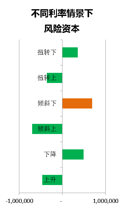 該示例展示了六個(gè)情景下風(fēng)險(xiǎn)資本的情況。六個(gè)情景中最不利的情景是利率先上升后下降的情況。結(jié)合傾斜下的久期缺口可知,在前10年由于缺口為正,資產(chǎn)不敏感,此時(shí)利率上升是不利的情景。10年之后是負(fù)缺口,負(fù)債更為敏感。此時(shí)利率下行同樣是不利的。因此在傾斜下的場景中,前期利率上升,后期下降的情況產(chǎn)生的風(fēng)險(xiǎn)資本是最高的甚至高于利率持續(xù)下降的情景。
