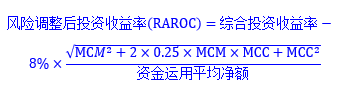 在此基礎(chǔ)上,要對(duì)常規(guī)匹配進(jìn)一步優(yōu)化完善,一是資產(chǎn)收益率上要考慮風(fēng)險(xiǎn)調(diào)整,即風(fēng)險(xiǎn)調(diào)整后的投資收益率(簡稱 RAROC),要在綜合投資收益率的基礎(chǔ)上減去所占用的兩方面資本影響,一是市場風(fēng)險(xiǎn)最低資本,二是信用風(fēng)險(xiǎn)最低資本,此處8%的系數(shù)是最新規(guī)則下的風(fēng)險(xiǎn)資本成本率,而歐“償二代”為6%。