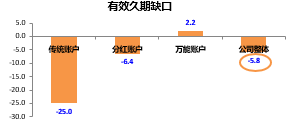 由圖可見,傳統(tǒng)賬戶有較大的久期缺口,分紅賬戶缺口較小,萬能賬戶久期為正值。公司整體綜合指數(shù)是-5.8,將該數(shù)值應(yīng)用在公司總體的利率風(fēng)險(xiǎn)下,若公司總資產(chǎn)為一千億,則利率上升一個(gè)點(diǎn),公司的資本增值58個(gè)億;下降一個(gè)點(diǎn),資本消耗58個(gè)億。