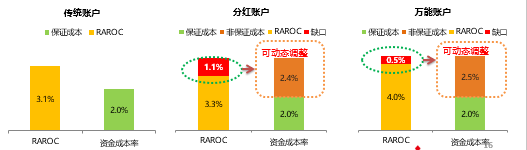 對(duì)于傳統(tǒng)賬戶來說,RAROC計(jì)算之后要扣除3.1%的動(dòng)態(tài)調(diào)整;分紅賬戶的收益經(jīng)過風(fēng)險(xiǎn)調(diào)整之后是3.3%,不足以覆蓋成本缺口,此時(shí)就要考慮是否動(dòng)態(tài)調(diào)整分紅利率;萬能賬戶需要做出1%的風(fēng)險(xiǎn)調(diào)整,它的RAROC是4.0%,也不足以覆蓋成本率,在此情況下,需要采取動(dòng)態(tài)調(diào)整非保證負(fù)債的措施。