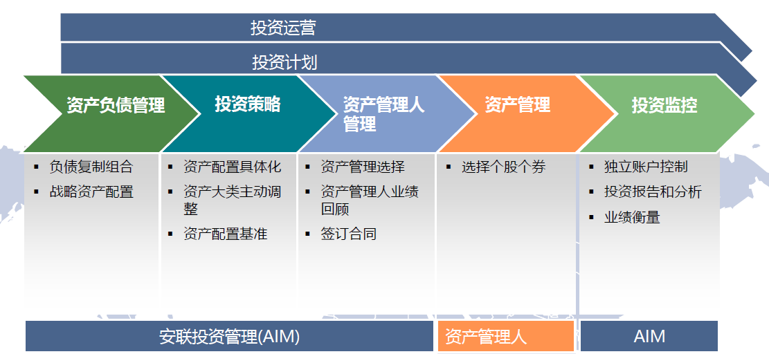 資產(chǎn)負(fù)債管理作為價(jià)值鏈的起始端,后面包括投資策略、資產(chǎn)管理人的管理、資產(chǎn)管理和資產(chǎn)監(jiān)控。在這個(gè)價(jià)值鏈上,首先要了解負(fù)債端的需求,將配置組合傳導(dǎo)到投資策略,再具體到大類配置的調(diào)整和配置基準(zhǔn)的設(shè)置,然后轉(zhuǎn)換成資產(chǎn)管理人的管理,在投資策略確定以后把這些標(biāo)準(zhǔn)設(shè)立到資產(chǎn)管理人的考核制度中。投資監(jiān)控是必須的,就是因?yàn)橛辛嗣總€(gè)獨(dú)立帳戶的設(shè)置、報(bào)表分析、業(yè)績(jī)衡量,才能更有效地實(shí)現(xiàn)從資產(chǎn)負(fù)債管理到資產(chǎn)管理人管理的價(jià)值鏈的價(jià)值。