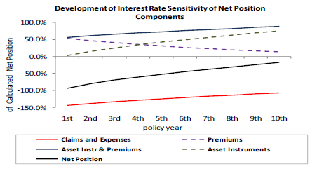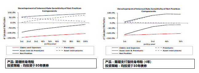 (2)從后續(xù)變化的久期差視角:隨著現(xiàn)金流的流入,我們可以把期繳產(chǎn)品的投資買成長(zhǎng)期資產(chǎn)匹配的產(chǎn)品,產(chǎn)品周期中可以確定一個(gè)參考年份,在該年份評(píng)估久期差,這樣做的好處就是讓管理層可以預(yù)見一段時(shí)間以后經(jīng)濟(jì)價(jià)值的利率風(fēng)險(xiǎn),是對(duì)投資收益的經(jīng)營(yíng)假設(shè)。不好的地方是假設(shè)太多,忽視參考日前的再投資風(fēng)險(xiǎn);要求對(duì)參考年份前遵循投資策略作出假設(shè);要求對(duì)參考日前現(xiàn)金流的投資收益率作出假設(shè);如何設(shè)定參考年份模棱兩可;忽略該產(chǎn)品的過去銷售對(duì)新產(chǎn)品久期差的降低;當(dāng)比較兩種產(chǎn)品時(shí),最初久期差和預(yù)期久期差可能會(huì)得出相反的結(jié)果。所以以時(shí)間來算久期差,既有好處也有壞處。