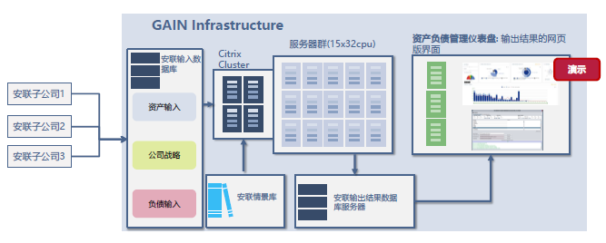 因?yàn)槲覀冏詈筮€是要把所有結(jié)果通過報(bào)表展現(xiàn)給管理層。這是隨機(jī)模型搭建的集團(tuán)資產(chǎn)管理的基礎(chǔ)設(shè)施,所有這些都是在一個(gè)平臺(tái)上面搭建的,這個(gè)平臺(tái)在歐洲,所有安聯(lián)子公司都會(huì)把自己的數(shù)據(jù)輸入到這個(gè)平臺(tái),同時(shí)我們有一個(gè)單獨(dú)的情景庫,就是所謂的ESG,這種情景器同時(shí)也會(huì)輸入cluster,通過服務(wù)器的運(yùn)作和計(jì)算把所有的數(shù)據(jù)導(dǎo)入到儀表盤。