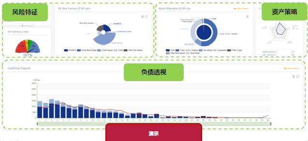 下面是報(bào)表,最左邊是風(fēng)險(xiǎn)特征,可以把風(fēng)險(xiǎn)因子呈現(xiàn)出來。右上角是資產(chǎn)策略,可以讓我們對(duì)不同資產(chǎn)策略導(dǎo)致的風(fēng)險(xiǎn)特征有詳細(xì)的了解,下面是現(xiàn)金流的展示,因?yàn)樵诟淖冑Y產(chǎn)配置的時(shí)候,現(xiàn)金流也會(huì)不斷配置,若負(fù)債端不變,可以很好地展現(xiàn)資產(chǎn)負(fù)債的透視。