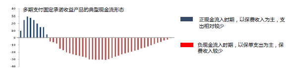 新增業(yè)務(wù)對(duì)資產(chǎn)負(fù)債的影響怎么管控?下面來看傳統(tǒng)壽險(xiǎn)產(chǎn)品運(yùn)營(yíng)負(fù)債現(xiàn)金流的組成,這里強(qiáng)調(diào)的其實(shí)就是現(xiàn)金流流入和流出的分化,現(xiàn)金流出包括理賠與給付中的死亡給付、退保支出、保單紅利、滿期給付等,以及成本費(fèi)用中的傭金等,還有一些再保費(fèi)用、稅金等;現(xiàn)金流入主要是期繳躉繳的保費(fèi)以及再保所得。