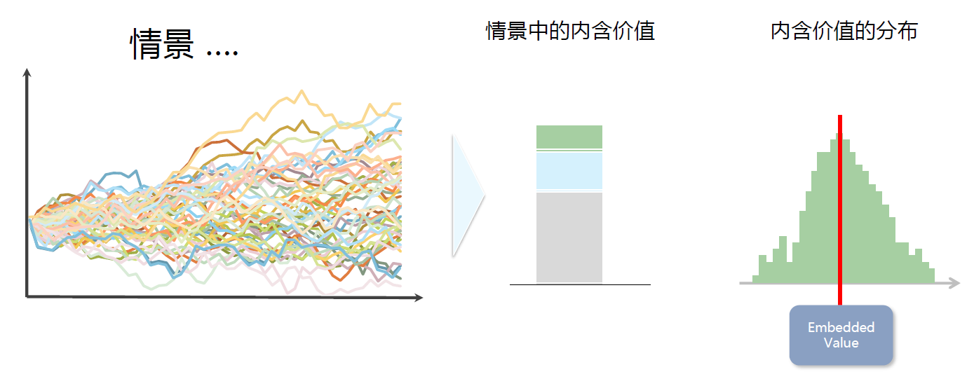 復(fù)雜的資產(chǎn)負(fù)債交互會(huì)導(dǎo)致壽險(xiǎn)負(fù)債的評(píng)估比較慢,當(dāng)分紅險(xiǎn)長(zhǎng)期負(fù)債端隨著投資回報(bào)變動(dòng)而變動(dòng)時(shí),我們?cè)趺从?jì)算內(nèi)涵價(jià)值。左邊是不同的情景,這些情景中的內(nèi)涵價(jià)值可以通過右邊綠色的分布展現(xiàn)出來,如果沒有現(xiàn)有的技術(shù),按照前面的交互平臺(tái)大概需要一個(gè)多小時(shí)的時(shí)間才能評(píng)估出來。