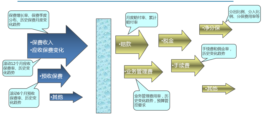 在以上每個項目都有規(guī)律可循,當然這些規(guī)律也會跟著公司的經(jīng)營策略進行變化。比如保費收入受公司預算要求影響比較大,應收保費率一般是年初比較大,年底比較小,預收保費率正好相反,賠款可以用月度或者滾動12個月賠付率進行預測,費用率相對比較容易預測。通過分析公司的歷史數(shù)據(jù)可以看到一些比較明顯的統(tǒng)計規(guī)律,特別是在季度、半年度和年度這樣的時點統(tǒng)計規(guī)律更明顯。