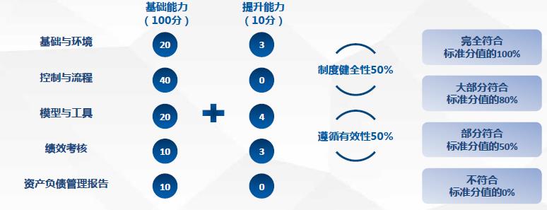 監(jiān)管制度包括監(jiān)管辦法、量化評(píng)估規(guī)則和能力評(píng)估規(guī)則,引導(dǎo)公司資產(chǎn)負(fù)債管理工作形成有效的正反饋機(jī)制。能力評(píng)估規(guī)則分為五個(gè)部分:基礎(chǔ)與環(huán)境、控制與流程、模型與工具、績(jī)效考核和資產(chǎn)負(fù)債管理報(bào)告。評(píng)分規(guī)則如下: