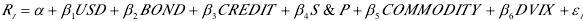Hasanhodzic and Lo(2007)、Chiu(2014)對于保險(xiǎn)資產(chǎn)組合的戰(zhàn)略資產(chǎn)配置進(jìn)行建模研究,選取影響因子包括美元指數(shù)(USD)、摩根大通美國公司投資評級指數(shù)(BOND)、投資級公司的信貸違約掉期指數(shù)(CREDIT)、高盛商品指數(shù)(COMMODITY)、標(biāo)準(zhǔn)普爾指數(shù)(S&P)、芝加哥期權(quán)交易所市場波動率指數(shù)(DVIX),具體模型如下。