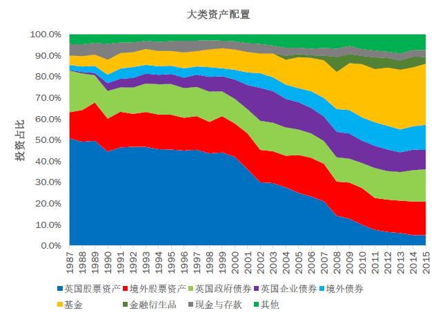 從80年代末到2000年之前,英國保險(xiǎn)公司還有養(yǎng)老金這些機(jī)構(gòu)投資者的大類資產(chǎn)配置基本是40%的債券、60%的股權(quán),或者是各50%。傳統(tǒng)的資產(chǎn)配置大概從2000年之后發(fā)生了結(jié)構(gòu)性轉(zhuǎn)變,最為明顯的有四點(diǎn),一是權(quán)益類投資占比大幅度下降,二是固收類占比大幅度增加,尤其是公司債還有其他類型信用債比例增加非常明顯,三是另類投資占比也逐漸變高,我們看到黃色部分是基金配置的占比,基金有相當(dāng)?shù)囊徊糠质橇眍愅顿Y,四是海外投資占比在逐漸增加。這樣的趨勢都是因?yàn)楸kU(xiǎn)公司通過資產(chǎn)負(fù)債匹配,分散資產(chǎn)風(fēng)險(xiǎn),從而達(dá)到更好的資本運(yùn)用效率。