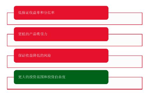 通過以上內(nèi)容,我們可以看出,非分紅型保險的一個主要前提條件是資產(chǎn)負債管理,資產(chǎn)負債匹配程度很高。而分紅型保險這方面的要求相對較小,可以不用太擔(dān)心資產(chǎn)和負債的匹配,需要滿足對最低保證收益的部分。而且如果看歐洲分紅型保險目前的發(fā)展趨勢,最低保證收益在新的分紅型產(chǎn)品里在逐漸下降,有些保險公司甚至降到了0。這么做是為了減少監(jiān)管對分紅型保險資產(chǎn)匹配的要求。資產(chǎn)負債自動聯(lián)動的程度更高,整體風(fēng)險相對來說比較小。所以我們看分紅型保險目前面臨的挑戰(zhàn),實際上跟剛才講的非分紅型的差不多,但是它們有很大的優(yōu)勢就是他們可以有更大的投資范圍和投資自由度。