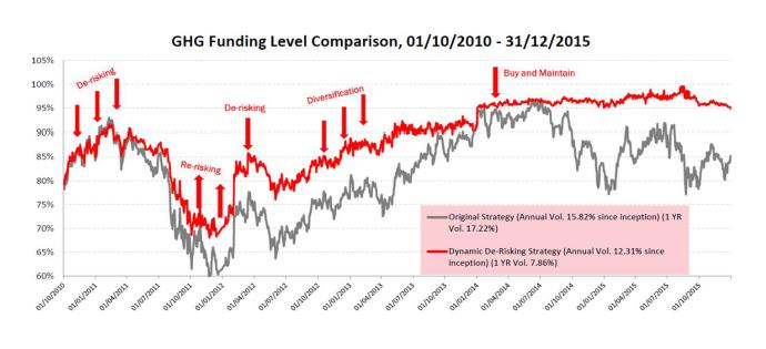 這里有很重要的一點是2012年整體的資產(chǎn)負債比回到85%之后,我們下一步并沒有追求絕對收益,而是盡量分散風(fēng)險,因為最終的目標(biāo)是在10年內(nèi)達到資產(chǎn)負債比1:1,而在當(dāng)時,該養(yǎng)老基本并不需要承擔(dān)過大的投資風(fēng)險就可以達到這一目標(biāo)?,F(xiàn)在用回溯的方法來看,在那段時間中,其實最好的投資策略是百分之百進入權(quán)益類資產(chǎn),回報很高。這也是為什么原始的匹配方案在資產(chǎn)負債比上追得很快的原因。但是我們可以看到,在2014年間,即便是穩(wěn)健保守的投資方式也達到幾乎百分之百的資產(chǎn)負債比。