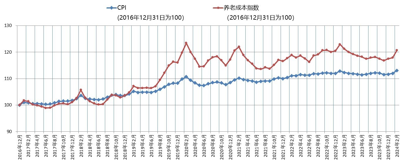 (圖一):2016年底至2024年2月CPI及養(yǎng)老成本指數(shù)走勢(shì)圖