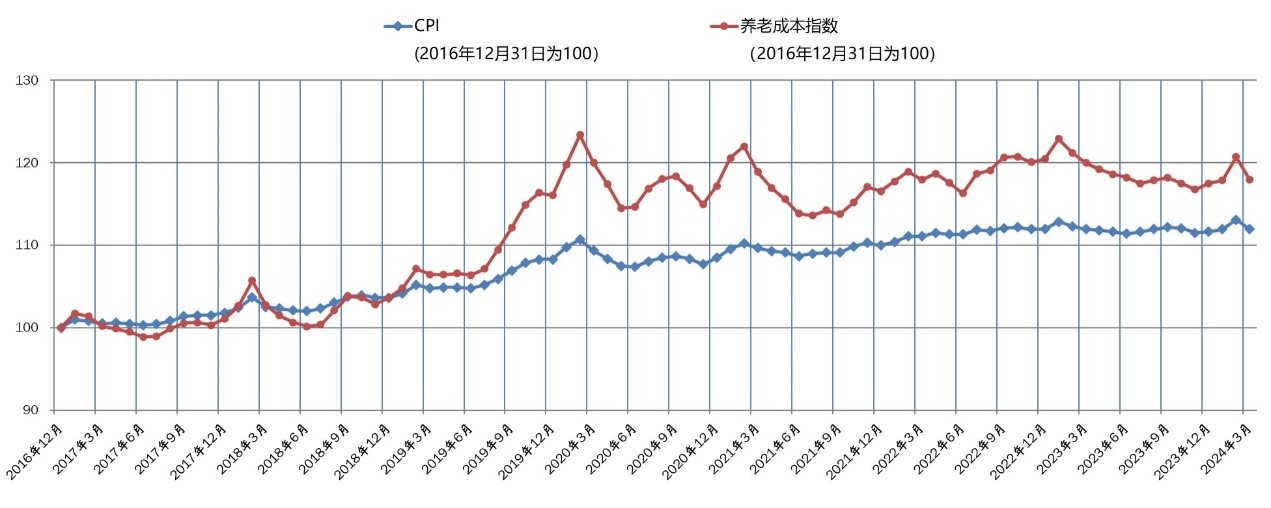 (圖一):2016年底至2024年3月CPI及養(yǎng)老成本指數(shù)走勢圖