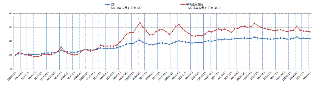 (圖一):2016年底至2024年6月CPI及養(yǎng)老成本指數(shù)走勢(shì)圖