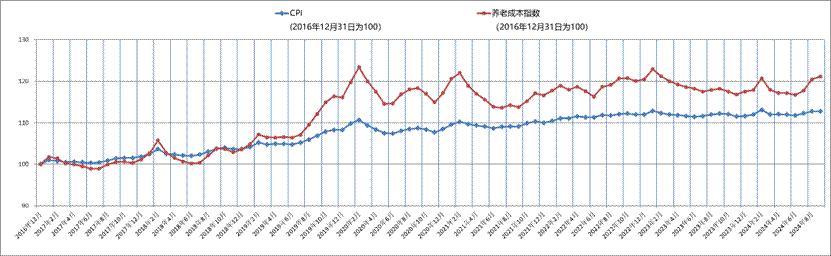 (圖一):2016年底至2024年9月CPI及養(yǎng)老成本指數(shù)走勢圖