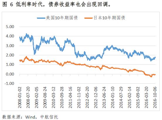 在利率已經(jīng)明顯下行的時(shí)候,主動管理變得更為重要。如何利用市場波動,把握時(shí)機(jī)主動創(chuàng)造alpha,將是低利率中后期債券投資的重要內(nèi)容。尤其是經(jīng)濟(jì)呈現(xiàn)好轉(zhuǎn)跡象、貨幣政策趨于穩(wěn)定甚至邊際略有收緊時(shí),債券資產(chǎn)的配置需謹(jǐn)慎,時(shí)機(jī)的選擇和波動機(jī)會的把握較為重要。典型的例子是2013年美國和日本的債券市場。2013年美聯(lián)儲縮減量化規(guī)模(每月減少100億至750億),第四季度經(jīng)濟(jì)增速高達(dá)4.1%,結(jié)果債券市場就出現(xiàn)了明顯的調(diào)整,10年期國債收益率反彈至3%。而同期日本國債收益率并未出現(xiàn)明顯的調(diào)整。