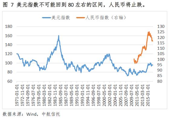 未來幾年人民幣繼續(xù)貶值的空間有限。隨著美元的高位走平,人民幣將止跌企穩(wěn),并有可能略有升值。首先,人民幣匯率的經(jīng)濟(jì)基本面并不差。影響匯率的因素有兩種:國際收入和支出狀況、經(jīng)過風(fēng)險(xiǎn)調(diào)整的金融資產(chǎn)收益率比較。從國際收支的角度看,中國5%到7%的經(jīng)濟(jì)增速在全球仍具有較強(qiáng)的競爭力,貿(mào)易持續(xù)順差,國際收支不支持人民幣缺乏持續(xù)貶值。在資本項(xiàng)目相對開放情況下,金融資產(chǎn)收益率對于匯率的影響更為明顯,但目前中國資金出入境仍存在一定的管控。從經(jīng)濟(jì)增長率、金融市場發(fā)展和資本市場開放度等長期因素看,未來幾年金融資產(chǎn)收益率也不支持人民幣匯率的長期貶值。