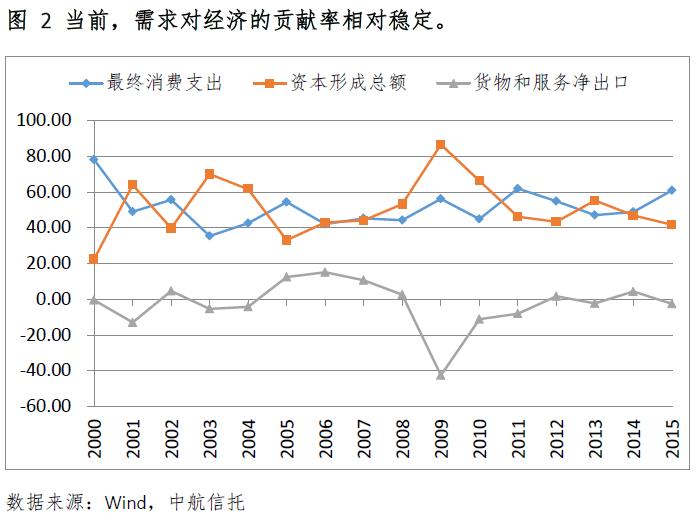 從過去幾年的數(shù)據(jù)看,中國經(jīng)濟(jì)經(jīng)歷了不同的發(fā)展階段,每個(gè)階段的驅(qū)動因素各不相同。從2000年到2007年,中國經(jīng)濟(jì)實(shí)現(xiàn)了持續(xù)高增長。從圖 2可知,200年到2004年,最終消費(fèi)支出貢獻(xiàn)率逐步下行,資本形成總額貢獻(xiàn)率上行。2005年到2008年,凈出口的貢獻(xiàn)率一度接近20%。金融危機(jī)和“四萬億”政策在經(jīng)濟(jì)結(jié)構(gòu)上體現(xiàn)為資本形成貢獻(xiàn)率躍升和凈出口貢獻(xiàn)率下降。2011年至今,經(jīng)濟(jì)增速穩(wěn)步下降,消費(fèi)、投資和凈出口的占比基本穩(wěn)定,消費(fèi)貢獻(xiàn)率略有提升,投資貢獻(xiàn)率略有下降,經(jīng)濟(jì)結(jié)構(gòu)逐步優(yōu)化。
