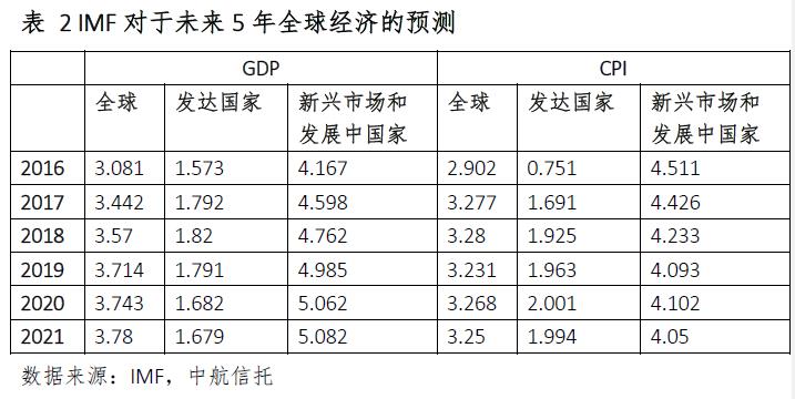 綜合而言,預(yù)計(jì)世界經(jīng)濟(jì)未來幾年的增速將較平穩(wěn),處于3%到4%之間。預(yù)計(jì)美國GDP增速在1.5%到2%之間,通脹在2%的目標(biāo)值上下波動,美聯(lián)儲可能在未來幾年逐步加息至2%,維持積極的財(cái)政政策以刺激需求。預(yù)計(jì)歐元區(qū)不會出現(xiàn)趨勢性復(fù)蘇,GDP增速可能在1%到1.5%之間,通脹維持在2%以下,歐央行將維持量化寬松以實(shí)現(xiàn)事實(shí)上的“財(cái)政赤字貨幣化(monetization of fiscal deficits)”。歐元區(qū)也將實(shí)行中度寬松的財(cái)政政策。前幾年新興市場和發(fā)展中國家受困于能源價(jià)格下滑、資本流出和貨幣貶值壓力,表現(xiàn)較差。未來幾年,長期的商品價(jià)格下跌和美元指數(shù)上行告一段落,發(fā)展中國家有望逐步改善。