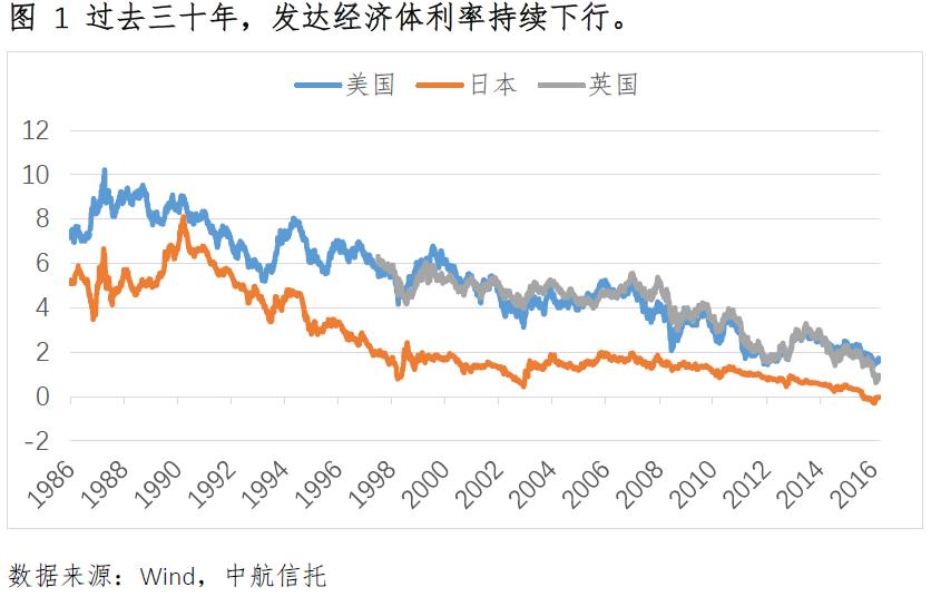 當(dāng)前全球利率出現(xiàn)趨勢性下行。以美國、日本和英國為例,利率從上世紀(jì)八十年代持續(xù)下行約三十年,英美10年期國債收益率從10%的高點(diǎn)下滑到2%左右,日本甚至從8%的高點(diǎn)下滑到零利率。