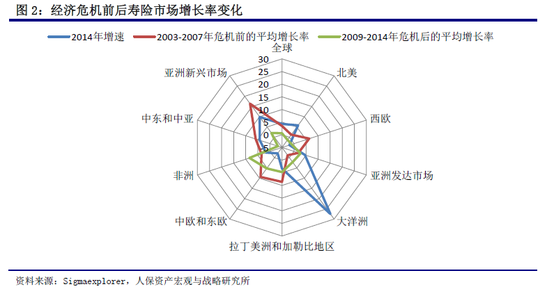 筆者認為,這主要有兩方面原因:一方面,盡管低于金融危機前的水平,但中國壽險市場仍是全球增長最快的地區(qū)之一(圖2)。業(yè)務規(guī)模是未來公司發(fā)展壯大和盈利增長的基礎,相比之下發(fā)達國家保險市場的主要目標是管理做好存量的資產和負債管理。另一方面,行業(yè)資產負債管理能力和經驗還不成熟。資產負債管理能力是以負債業(yè)務的多樣性和投資渠道的多元化為基礎的。伴隨著2012年以來以“市場化改革”為核心的監(jiān)管思路,中國壽險業(yè)真正意義上的資產負債管理開始起步,目前還處于經驗積累的階段。