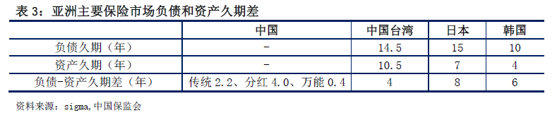 其中,中國保險業(yè)同樣面臨“資產荒”問題的困擾。但橫向來看,由于長期費率管制、資本市場回報相對較高,中國保險業(yè)的利差損風險屬于全球溫和偏低水平。中國壽險產品在期限上的錯配情況也屬于亞洲較低水平(表3)。