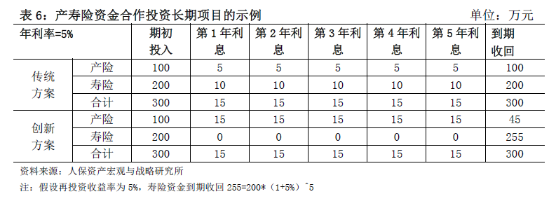 由于財險的資產比負債期限長、而壽險則相反,因此,可以通過集團框架下的“天然對沖”減少各自利率風險的暴露。假設產、壽險資金分別出資100萬元和200萬元共同投資于一個5年期、年化收益率5%的基礎設施債權計劃(表6)。其中約定,產險資金獲得每期全部利息收入,壽險資金則在到期后獲得本息收入。這種結構化設計將緩解產險資金參與長期投資的流動性壓力,也使得壽險資金避免了再投資風險。