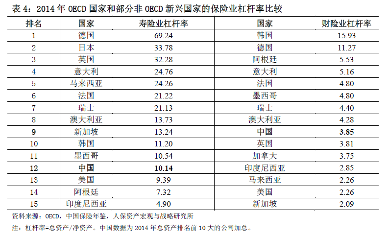 第四、提升資本利用效率。我們認為,相比其他金融行業(yè),保險公司杠桿化操作多數為表內業(yè)務,受到監(jiān)管部門的正常監(jiān)管,杠桿風險能夠得到很好的控制管理;而且與OECD發(fā)達國家相比,中國保險市場的杠桿比率屬于中等偏下(表4)。
