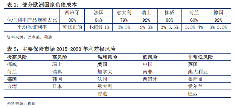 如果把目光聚集在保險資金,我們也可以看到全球范圍內的保險資金均面臨著不同程度的利差損風險。挪威、荷蘭、德國、臺灣等地區(qū)較為嚴重,北美、法國、意大利等相對溫和。南非、西班牙由于壽險產品設計靈活性較高,抵御了一部分長期利率風險;英國、澳大利亞等國市場由于利率敏感型產品占比較大或保證利率較低,利差損風險暫時不高(表1、表2)。