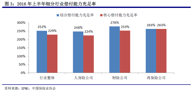 各國保險業(yè)杠桿率受到監(jiān)管體制的影響較大,目前中國是通過風險導向的償付能力體系來控制保險公司的杠桿風險。數據顯示,2016年一季度,全行業(yè)綜合償付能力充足率為252%、核心償付能力為229%(圖3),遠高于監(jiān)管下限。較高的償付能力充足率顯示了行業(yè)的抗風險能力,也同時說明了行業(yè)的資本冗余較為嚴重。特別是對于一些大型公司,在償二代體系下應提高資本利用效率。