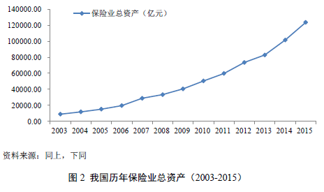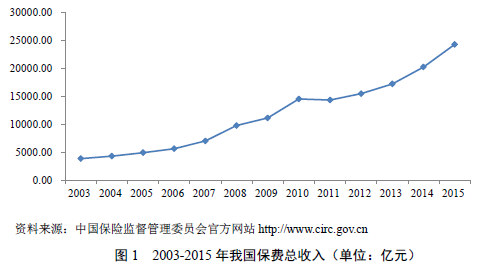 隨著我國保險業(yè)的迅速發(fā)展,尤其是壽險業(yè)在經(jīng)歷產(chǎn)品創(chuàng)新轉(zhuǎn)型等深層次變革之后,保費收入不斷增長,保險資金規(guī)模亦不斷增加。加入WTO的五年期間(2001-2006),我國保險費總收入的年平均增長達(dá)到25.74%,2007年的保費達(dá)到了7035億,同比增長了21.9%,2015年總保費為24282億元,為2003年總保費收入的六倍多(參見圖1)。