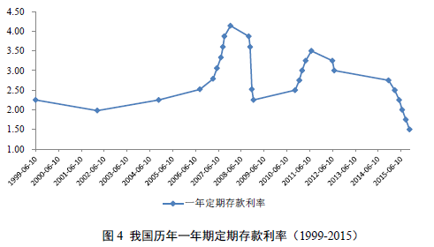 2008年9月爆發(fā)的金融危機(jī)被認(rèn)為是“自上個世紀(jì)大蕭條以來最嚴(yán)重的一次危機(jī)”,其根源可歸為三個方面:1、金融市場的失靈和監(jiān)管不足,金融市場失靈使得金融資源配置低效率,市場風(fēng)險預(yù)警不足,監(jiān)管乏力;2、過度寬松的貨幣政策。過度寬松的貨幣政策引發(fā)流動性過剩,各國政府為應(yīng)對金融帶來的不利影響,紛紛降息,全球進(jìn)入降息周期,借以刺激投資,以拉動經(jīng)濟(jì)走向復(fù)蘇。3、全球金融治理的缺失。目前,國際貨幣基金組織和世界銀行等主要世界性全球治理機(jī)構(gòu)在很多議題上常常陷入僵局,而世界貿(mào)易組織、巴塞爾協(xié)議III以及京都議定書等國際組織在治理形式上也變得過于松散化、多元化、碎片化,多邊協(xié)定能力相對缺乏(Willem Molle,2014)。我國一年期存款利率在經(jīng)歷危機(jī)前高速增長以后,2008年下半年迅速回落,2011-2012年經(jīng)歷短暫反彈后,利率自2014年出現(xiàn)進(jìn)一步的下降態(tài)勢(參見圖4)。