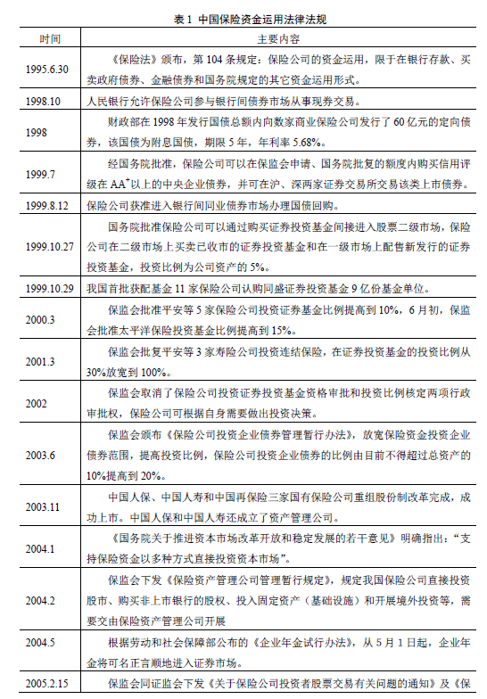 第三階段,成熟發(fā)展。2005年2月,中國保監(jiān)會聯(lián)合中國銀監(jiān)會下發(fā)《保險公司股票資產(chǎn)托管指引(試行)》和《關(guān)于保險資金股票投資有關(guān)問題的通知》,明確了保險資金直接投資股票市場涉及的資產(chǎn)托管、投資比例、風(fēng)險監(jiān)控等有關(guān)問題。同時出臺的《關(guān)于保險資金股票投資有關(guān)問題的通知》中,對保險機(jī)構(gòu)投資者股票投資的總比例和單項比例等內(nèi)容也作了明確規(guī)定。[1]《通知》要求,保險機(jī)構(gòu)投資者股票投資應(yīng)當(dāng)依據(jù)《指引》,立足于長期、穩(wěn)健投資,建立切實可行的風(fēng)險控制制度,實施股票投資全過程風(fēng)險控制。2009年10月,新《保險法》第一百零六條規(guī)定:“保險公司的資金運用必須穩(wěn)健,遵循安全性原則。保險公司的資金運用限于下列形式:(1)銀行存款;(2)買賣債券、股票、證券投資基金份額等有價證券;(3)投資不動產(chǎn);(4)國務(wù)院規(guī)定的其他資金運用形式?!保▍⒁姳?)。