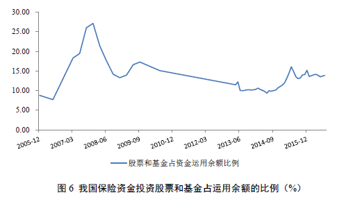 與固定收益類資產(chǎn)相反,權(quán)益類資產(chǎn)收益更多取決于市場行情,隨市場而動,可以有效分享資本增長效果。根據(jù)投資學(xué)經(jīng)典理論,股票價格與利率水平呈反比,低利率對資本市場來講,無疑是一場發(fā)展機(jī)遇。因此,在低利率時期,增加權(quán)益類資產(chǎn)的有效配置顯然更為迫切而必須。利用股權(quán)類資產(chǎn)投資“杠桿”的放大效應(yīng),不僅能有效提升保險資金的運用效率,還能增加投資收益,同時,保險資金具有長期性穩(wěn)定性等特點,其進(jìn)入資本市場無疑也會進(jìn)一步帶動資本市場發(fā)展,形成良性互動,實現(xiàn)“共贏”。近年來,我國保險資金投資股票和基金占保險資金運用余額比例呈現(xiàn)增長趨勢(參見圖6)。